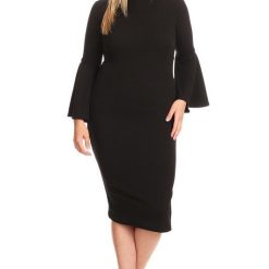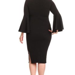 This figure-flattering sheath dress is perfect for any formal or professional event. The solid black color is versatile and can be dressed up or down, while the midi length is both stylish and practical. The mock neck provides a touch of elegance, while the 3/4 length bell sleeves and side slit at the hem add just the right amount of drama. Plus, the side pockets are a handy bonus!